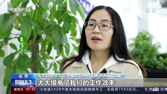 山东自贸试验区济南片区 外贸企业负责人 梁美兰:原来我们是联系货代(货物代理),处理订舱、报关、转运等这些工作,现在通过自贸区的服务平台,可以实现无纸化操作,大大提高我们的工作效率,使我们的货物及时发到客户手中。